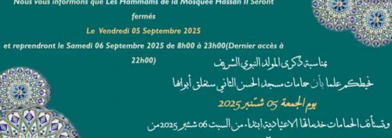 La Fondation de la Mosquée Hassan II de Casablanca informe son aimable clientèle qu'à l'occasion de la fête de la commémoration de la fête d'Al Mawlid Annabawi Al Charif, les Hammams de la Mosquée Hassan II seront fermés le vendredi 05 septembre 2025. Les Hammams reprendront leus activités habituelles à partir du samedi 06 septembre 2025 de 08h00 à 23h00 (dernier accès à 22h00).